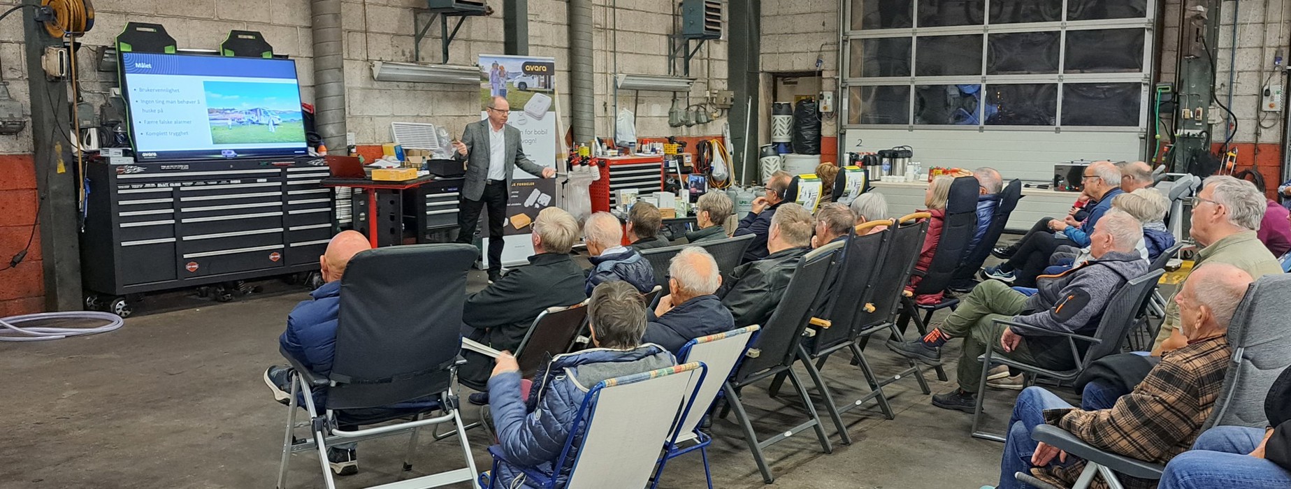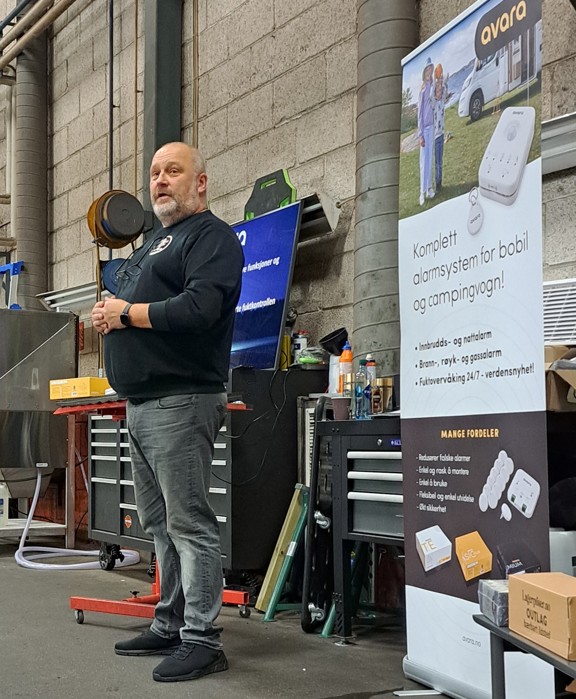 Vi fikk en flott presentasjon av sikkerhet- og fuktsystemet Avara, vertsfirmaet fikk presentert sine tjenester, vi fikk 15% rabatt på tilbehør, lærte litt om hvordan få et effektivt kjøleskap og om avregistrering av bobil. Dessuten ble vi servert kringle, pølser, brus og kaffe og noen vant gevinster i lotteriet.