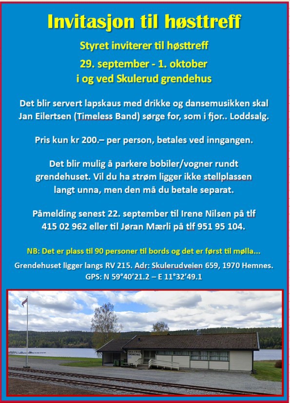 Vi inviterer til høsttreff i og ved Skulerud grendehus 29. september til 1. oktober